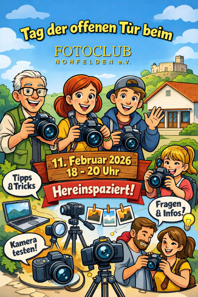 Der Fotoclub Nohfelden e. V. lädt am 11.02.2026 von 18:00 bis ca. 20:00 Uhr herzlich zu einem Tag der offenen Tür ins Dorfgemeinschaftshaus Selbach ein. Als aktiver Verein für Fotografie in der Region möchten wir allen Interessierten die Möglichkeit geben, uns kennenzulernen und in die vielfältige Welt der Fotografie hineinzuschnuppern.